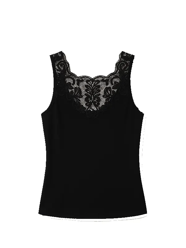 Black Lace-Embellished Tank Tops with Sequins and Fitted Cut