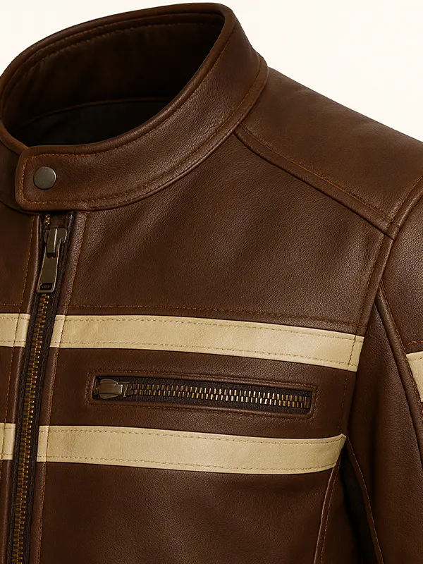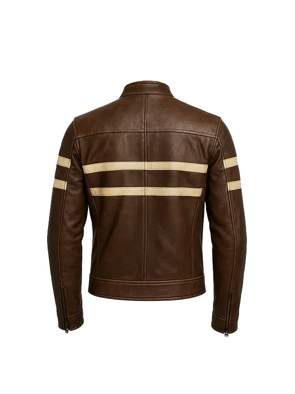 Brown Distressed Cruiser Biker Leather Jacket with Creme Stripes