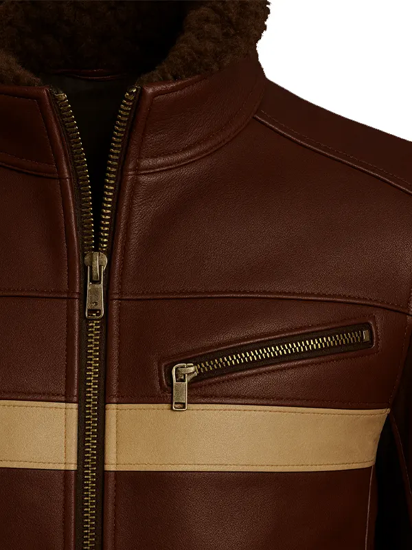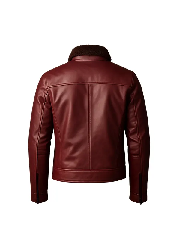 Slim Fit Biker Leather Jacket in Burgundy with Faux Fur Collar