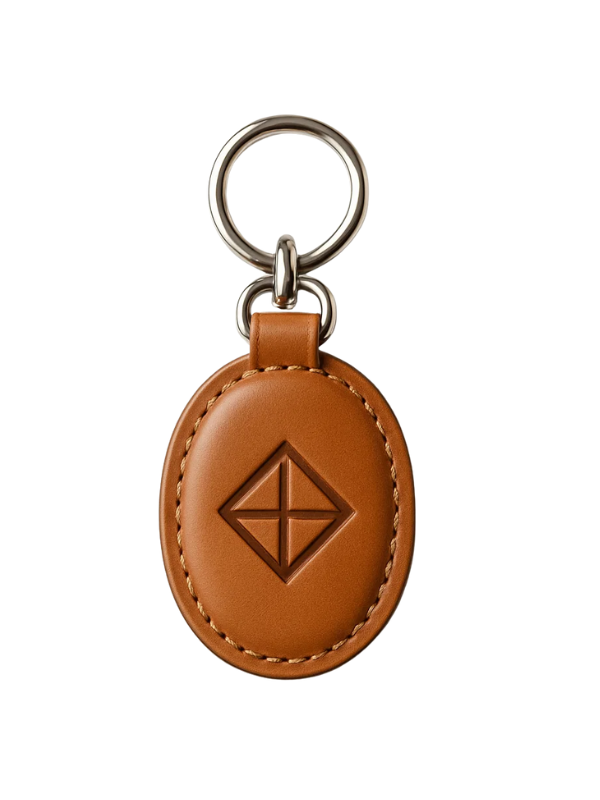 Tan Oval Leather Keychain with Embossed Geometric Logo