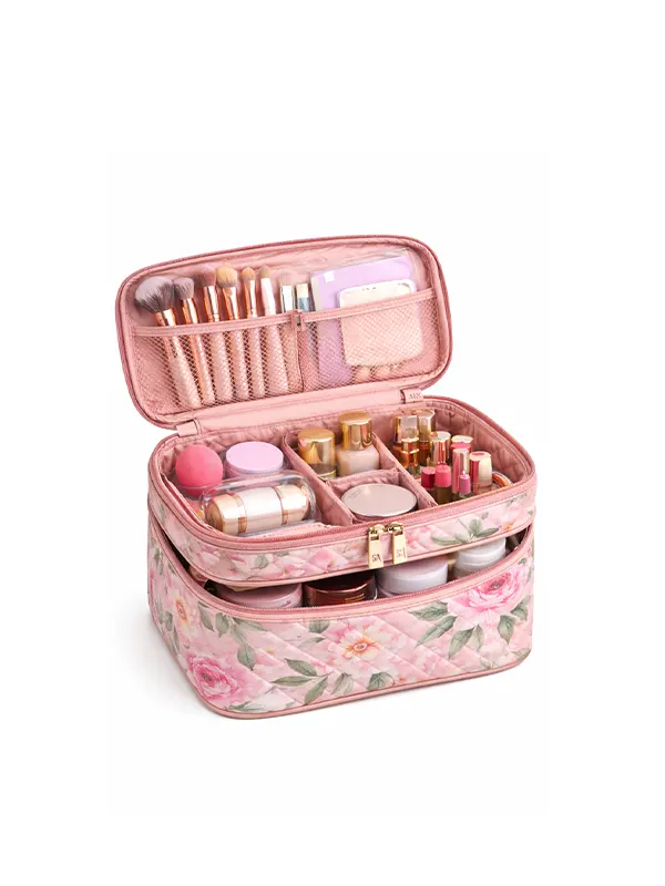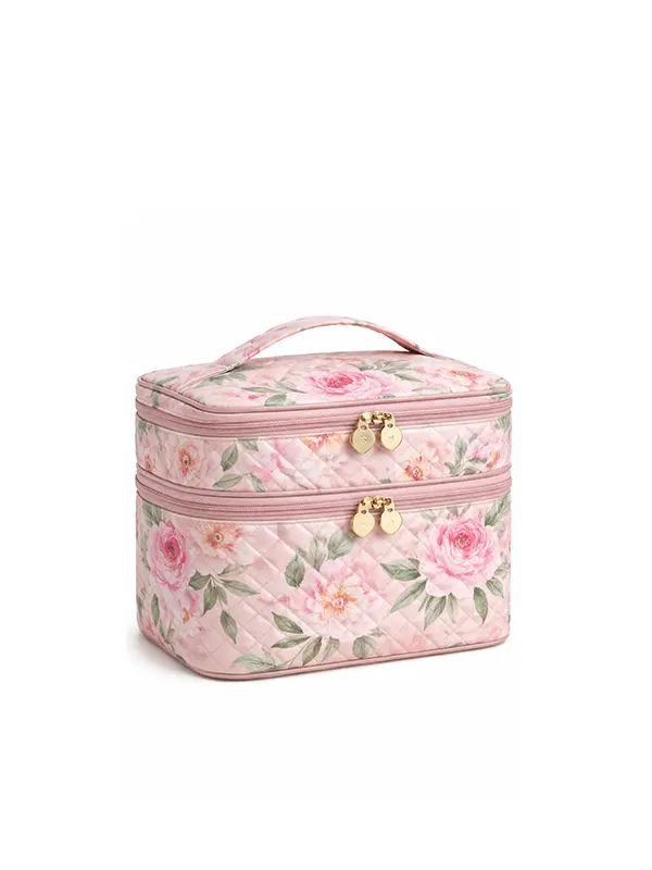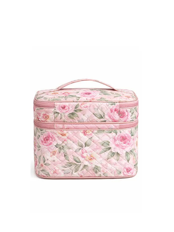 Wholesale Large Quilted Floral Double-Zip Cosmetic Travel Bag with Dual Compartments