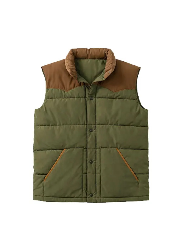 Wholesale Premium Sleeveless Workwear Brown & Green Two-Tone Puffer Vest combines rugged functionality with modern street-ready style. This vest is made from durable materials, features insulated padding, and is constructed with lightweight fabric. Its brown and green color combination gives it an industrial look. This makes it a versatile layer that can be worn both outdoors and for everyday use.